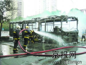 今晨6點30分,蒲黃榆路南向北方向的路面上擠滿了機動車,空氣中彌漫著焦糊的味道。在國美電器城門前,一輛被燒得只剩下車架子的17路公交車停在路邊,多名消防員正在清理現(xiàn)場!叭剂瞎蘧驮谲図斏,大家都離遠點、離遠點!”趕到的民警不時勸阻過往行人不要靠前。