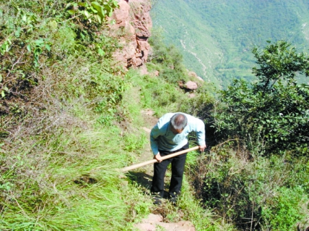 昨日上午,5位驢友帶上大米和油,踏上了老人修的小路。有經(jīng)驗的驢友說,山路需要先踩出來痕跡,一遍一遍尋找最合適的坡度和繞行路徑,才能筑修。