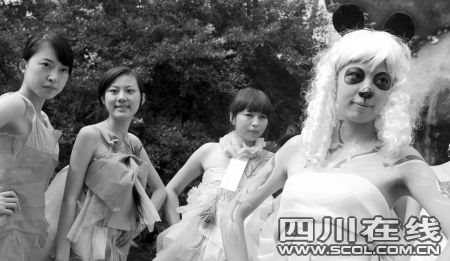 “怎么把眼睛和鼻子都涂黑了呀?哦!原來是熊貓模特兒,看,身上還畫了竹子呢!”昨日上午,在成都塔子山公園鳥語林,一位美女模特頭戴白色假發(fā),眼睛、鼻子都被涂成黑色,把自己裝扮成一只大熊貓。除了這種人體彩繪,參加活動的大學(xué)生志愿者還表演了一場精彩的環(huán)保紙裝秀,她們用這種健康、綠色、和諧的方式來向大家倡導(dǎo)環(huán)保理念,吸引了眾多游人觀看。