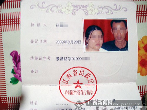 隨后,兩人帶來(lái)了一個(gè)年輕女子。從女子出具的身份證和戶(hù)口本上得知,她叫張×蘭,廣西賓陽(yáng)人,今年28歲。見(jiàn)該女子模樣不錯(cuò),汪家心生喜歡。8月28日,汪先生支付了幾千元介紹費(fèi)給中間人后,和張×蘭到當(dāng)?shù)鼗橐龅怯洐C(jī)關(guān)進(jìn)行了登記。
