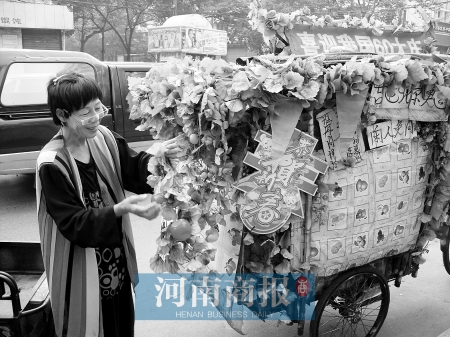 昨日上午10時(shí)許,一輛披著鮮花,插著國(guó)旗的彩色三輪車出現(xiàn)在鄭州市經(jīng)八路上。