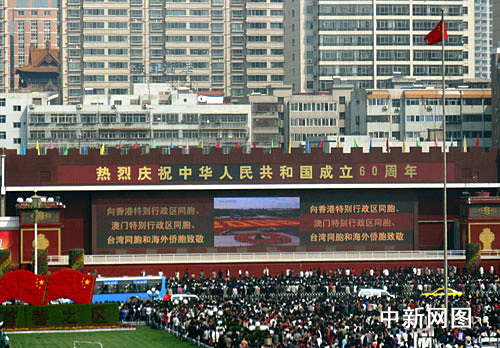 記者上午9時許來到蘭州東方紅廣場看到,這里早已是人山人海,川流不息。10時,當黨和國家領導人在首都天安門城樓上的畫面出現,此間民眾不約而同的鼓掌歡迎。