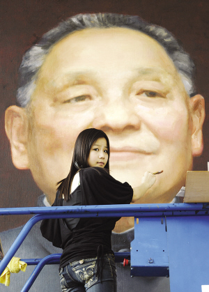 1日上午,新中國成立60周年慶祝大會在北京天安門廣場及長安街沿線舉行。當游行隊伍簇擁著新中國4位不同時代領(lǐng)導(dǎo)人毛澤東、鄧小平、江澤民和胡錦濤的巨幅畫像走過天安門廣場時,4位領(lǐng)袖的原音首次在廣場上先后重現(xiàn),象征著新中國發(fā)展歷程中4座偉大的里程碑,令全國觀眾印象深刻。當“春天的故事”方陣簇擁著的改革開放總設(shè)計師鄧小平巨幅畫像經(jīng)過天安門廣場時,站在天安門廣場上一位1988年出生的南京女孩特別激動,因為她參與繪制了這幅6米高、5米寬的肖像油畫。她的名字叫周末,中央美院的學(xué)生。