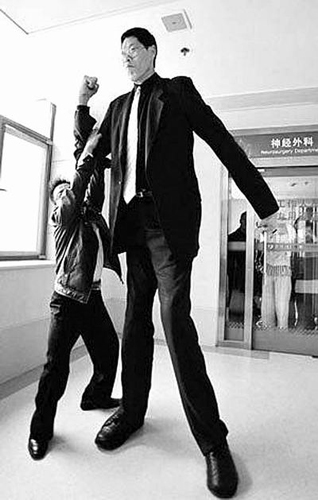 今年27歲的趙亮是濮陽(yáng)南樂(lè)縣梁村鄉(xiāng)西崇町村人,身高2.46米,這一高度比姚明高20厘米、比曾有“世界第一巨人”之稱(chēng)的鮑喜順還高出10厘米,是名副其實(shí)的“第一高人”。趙亮16歲時(shí)身高就已達(dá)到1.90米,17歲時(shí)被推薦到河南省體校籃球隊(duì),在一次扣籃時(shí)左腳扭傷,一直未能痊愈。今年4月,天津一家醫(yī)院免費(fèi)為趙亮進(jìn)行了腳傷手術(shù)。不久,成為媒體關(guān)注焦點(diǎn)的趙亮被歐寶地板聘請(qǐng),成為公司一名管理人員。上班后,趙亮作為企業(yè)形象大使備受社會(huì)關(guān)注。