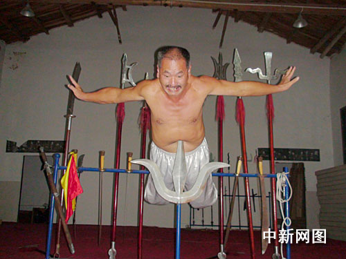 中新網(wǎng)永春10月12日電 (林永傳 顏堯民 施由森)以腹部作為支點(diǎn),雙腳支在鐵欄上,然后整個(gè)人身體懸空,普通人一般無(wú)法做到這點(diǎn),而福建永春縣白鶴拳師顏大石卻可以以鋒利的鋼叉作為支點(diǎn),整個(gè)人懸空,其白鶴內(nèi)功令人叫絕。