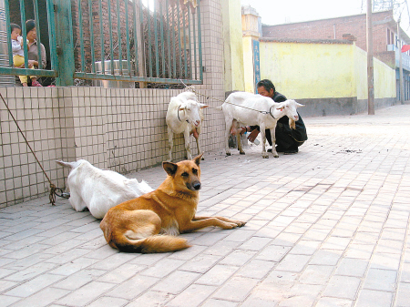 幾天前,記者在韋曲街道見到了老魏,老魏正忙著擠羊奶。老魏告訴記者,他養(yǎng)這4只奶山羊,“虎子”幫了大忙咧。老魏說的“虎子”其實就是臥在4只羊跟前的一條黃狗!斑@虎子今年才3歲,可真是羊的鐵桿保鏢!崩衔撼鲩T賣羊奶,他背個手在前面走,“虎子”領(lǐng)著羊兒跟在后面。到了下午,老魏到坡上放羊。他把“虎子”叫到羊跟前,吩咐一聲“把羊看好”后,便忙別的事!盎⒆印笨墒潜M職盡責(zé),一直守在羊跟前,生人要想靠近羊兒連門都沒有。天快黑了,老魏來到坡下,“回家咧!”一聲吆喝,“虎子”領(lǐng)著羊群順溜溜地下了坡。“3年來,還沒丟過羊呢!崩衔赫f起虎子來贊不絕口。