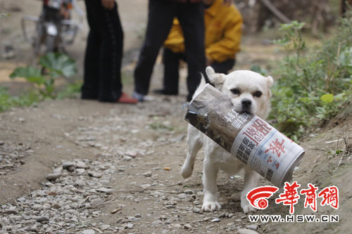 每天上午9時,給李爺爺家送華商報的投遞員張躍進(jìn),會準(zhǔn)時到達(dá)位于西安市南郊的東三爻堡!皥蠹垇磉!”站在李爺爺家門前一段50多米長的坡路下,張躍進(jìn)會扯著嗓子吆喝一句。幾秒鐘后,張躍進(jìn)和周圍的鄰居便會看到,一條黃白相間的小狗,從坡路上飛快地跑來,用嘴叼起張躍進(jìn)遞來的報紙!翱烊!把報紙給爺爺!甭犃藦堒S進(jìn)的話,小狗花花扭身徑直跑到李爺爺跟前,把報紙交到老人手中。