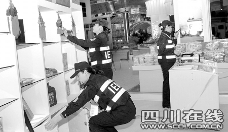 昨晚10點,新會展中心各展館里一片忙碌。在一群正在安檢的帥氣黑衣特警中間,3個扎著發(fā)髻的女特警格外引人注目。除負責現(xiàn)場指揮的教導員吳虹外,28歲的羅蕾正用伸縮臂鏡檢測著一食品展臺頭頂?shù)闹,而今年剛(cè)刖闹苋,則彎腰在一排展柜前仔細檢查著。和男特警一樣,她們都穿著帥氣的黑色警服,戴著警帽,不施粉黛,右胸前印有“成都特警”4個大字的閃光背心,將她們襯得格外颯爽。