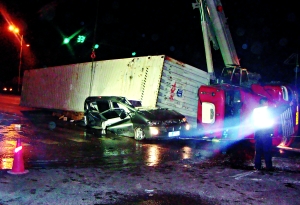 據(jù)有關(guān)部門介紹,昨日凌晨2時(shí)15分許,司機(jī)袁龍駕駛一輛內(nèi)蒙古牌照的集裝箱式大貨車,由密云縣前往遼寧省沈陽市運(yùn)送貨物。途中,該車經(jīng)通順路,由北向南行駛至順義區(qū)通順路米各莊路口時(shí),與一輛西向東駛來的現(xiàn)代商務(wù)轎車相撞。其間,貨車司機(jī)袁龍向左打輪躲閃過程中向右發(fā)生側(cè)翻,將商務(wù)轎車壓在右側(cè)貨箱之下,造成轎車內(nèi)人員全部被困。