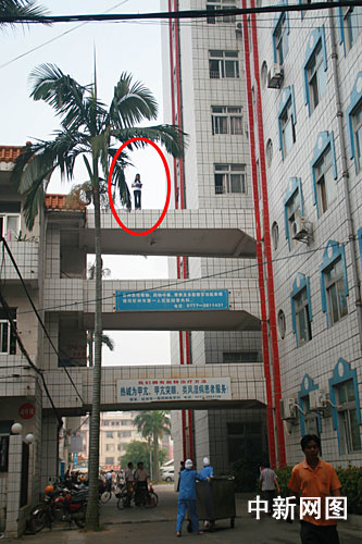 當日早上7時40分,欽州市消防支隊接到報警,第一人民醫(yī)院天橋有一名女子跳樓。接到報警后,支隊迅速調(diào)集2臺搶險救援車前往施救。當消防官兵趕到現(xiàn)場時,醫(yī)院天橋兩旁圍有很多圍觀群眾,一名年輕的女子站在天橋上面,手里拿著筆和筆記本,正在不停地寫著東西,不時地緊張地看看周圍的人群。據(jù)當時就診的醫(yī)生介紹,這名欲跳樓女子,早上同媽媽一起來到醫(yī)院婦產(chǎn)科檢查,發(fā)現(xiàn)這名女子已經(jīng)懷有身孕,后來不知怎么就要跳樓了。當日值班保安說,這名女子在上面已經(jīng)很久了,她媽媽也不敢上去,醫(yī)院已經(jīng)想了很多辦法,一接近她,她就揚言要跳樓。