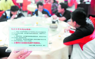 “看到桌上的提示牌都不好意思喝酒了,醉酒后還要讓工作繁忙的交警來代駕,多對(duì)不住人啊!弊蛉罩形,在位于開福區(qū)營盤路的天福家菜館用餐的李雄昂說。記者發(fā)現(xiàn),這里每張餐桌上都放著一張?zhí)崾九疲骸榜{駛員朋友:如您飲酒得不到家人朋友的理解不幫您代駕,那么請(qǐng)您打我的電話:13975155666。我們交警將為您提供免費(fèi)代駕服務(wù)。開福區(qū)交警大隊(duì)二中隊(duì)中隊(duì)長李樂。”