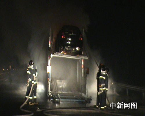 中新網淮安10月23日電 (郭志明 衡中強 朱曉穎) 23日凌晨3時許,江蘇淮安市洪澤消防中隊接到市支消防指揮中心指令稱,寧連高速向鹽城方向162公里處一拖車自燃,拖車所載的吉利自由觀新車亦被燒毀。消防聞訊后迅速處置。