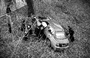 車后方坐著一名長發(fā)女子,滿臉是血,不時發(fā)出呻吟。另一名紅發(fā)男子倒在女子腳邊,一臉血跡。由于事發(fā)地點偏僻,現場并沒有目擊者。警燈閃爍,可以看到被撞的柳樹下方有一個約15厘米深的凹槽。