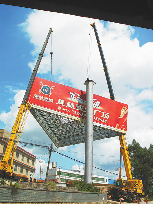 9月18日,記者在昆明國(guó)際會(huì)展中心附近看到,兩棵單立柱廣告牌正在被大吊車(chē)吊起。隨后幾天,記者在昆明的城南、城北地區(qū)都看到有關(guān)部門(mén)在拆除戶(hù)外廣告牌。記者從昆明市城管局獲悉,截至9月24日,昆明市主城區(qū)共拆除單立柱200棵。其中,五華區(qū)、高新區(qū)、度假區(qū)、呈貢已提前完成拆除任務(wù)。盤(pán)龍區(qū)、經(jīng)濟(jì)技術(shù)開(kāi)發(fā)區(qū)也開(kāi)始拆除高等級(jí)道路兩側(cè)的單立柱廣告。在昆明當(dāng)?shù),剩余的單立柱廣告已經(jīng)屈指可數(shù)。