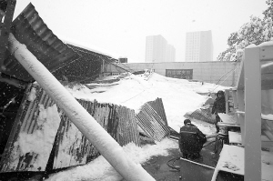 昨日15時許,裕華路與西二環(huán)交叉口一個建筑工地,漫天大雪讓工人們無法開工。忽然只聽“嘩啦”一聲巨響,工人張先生看到,他們的廚房——一座四五十平方米的活動板房從根部倒塌,鍋、灶、蔬菜等都被壓在了下面!爱(dāng)時里面沒有人,所以沒人受傷。”張師傅說,這個廚房負(fù)責(zé)100多人的伙食,這下子晚飯沒了著落。
