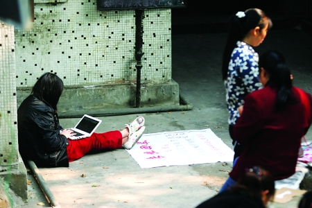 前日,網(wǎng)友“壞豬”在大渝網(wǎng)新聞報(bào)料吧上,以《史上最拉風(fēng) 收廢品女》為名發(fā)帖報(bào)料!皦呢i”在帖子中稱,前日上午,他剛好從該居民樓前經(jīng)過(guò)時(shí),隱約看到樓梯口有一黑影,轉(zhuǎn)頭查看,眼前的景象將他雷得“外焦內(nèi)嫩”:一身穿黑衣的女子,背靠墻壁席地而坐,身前放著一個(gè)寫有“專業(yè)回收”的廣告布,她對(duì)過(guò)往市民毫不理會(huì),而是專心敲打放在其大腿上的筆記本電腦。“我還從來(lái)沒(méi)看到過(guò)哪個(gè)收廢品的有這個(gè)女的這么潮!太拉風(fēng)了噻”。