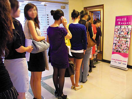 記者在面試現(xiàn)場看到,當(dāng)天前來應(yīng)征的靚女當(dāng)中,絕大多數(shù)在首輪就被淘汰,進(jìn)入到第二輪的只有五名。這五名中又有三位在過第三關(guān)———面談關(guān)時(shí)被淘汰了,只有兩人獲得與富豪見面的機(jī)會(huì)。三位靚女被淘汰的原因很簡單,一位因家里是母親做主,被認(rèn)為“太強(qiáng)勢”,不合要求;一位因有“許多個(gè)男性朋友”,被認(rèn)為用情太泛、不專一,被淘汰;還有一位是因?yàn)榇虬绮坏皿w、談吐大大咧咧,也被認(rèn)為不合要求。 應(yīng)征動(dòng)機(jī),多否認(rèn)“逐富”