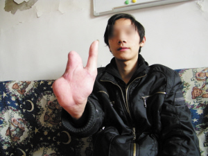 “我當(dāng)時疼極了!看到自己的4根手指已經(jīng)沒了,我心里特別害怕!”在這條生產(chǎn)線上工作的,都是小東的親屬。事發(fā)后,在舅姥爺?shù)膸ьI(lǐng)下,親屬們緊急將小東送到附近醫(yī)院。公司老板此時也得知了情況,并讓小東親屬將其轉(zhuǎn)到天津醫(yī)院進行治療。在搶救期間,小東的親屬將找到的四根手指帶到了醫(yī)院。但因為手指已碎,而且粘上了很多橡膠,已經(jīng)無法進行再植手術(shù)了。住院十余日后,小東出院了?粗皇O掳雮手掌的右手,小東多次掉下眼淚。