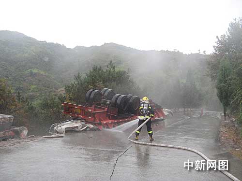 見此情況后,中隊指揮員對事故現(xiàn)場立即進行警戒,出兩支水槍進行稀釋。樂清市政府得悉情況后,立即起動應急預案,并調(diào)集公安、安監(jiān)、環(huán)保、交通、路政等相關(guān)部門趕赴現(xiàn)場處置。