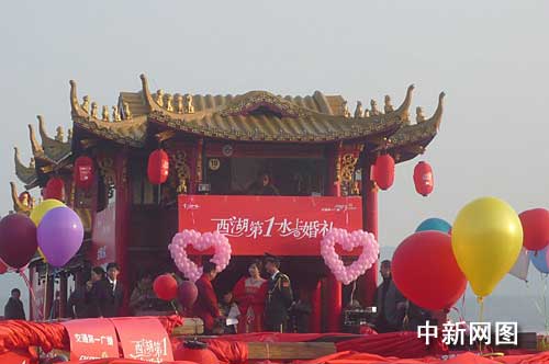 中新網(wǎng)杭州11月22日電(記者 柴燕菲 實習生 倪幼杰)今天下午,西湖上舉行了一場獨特而浪漫的水上婚禮。這是在西湖上迎來的第一對新人。更為特殊的是,婚禮的新郎是剛剛參加了國慶六十周年閱兵的戰(zhàn)士。