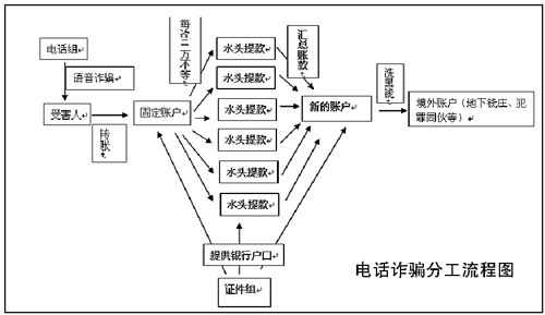 專案組確定該案是一個(gè)以境外人員為首的組織嚴(yán)密的犯罪團(tuán)伙所為。該團(tuán)伙通過網(wǎng)絡(luò)電話撥打事主電話,以事主家庭電話欠費(fèi)、銀行賬號(hào)涉嫌違法等為借口,騙取事主將賬戶內(nèi)的錢轉(zhuǎn)賬或提取現(xiàn)金后存入團(tuán)伙成員提供的“安全賬戶”內(nèi),并通過頻繁轉(zhuǎn)賬將賬戶內(nèi)的大額存款分散到多個(gè)賬戶內(nèi),其他成員則在全國各地分別提取現(xiàn)金。