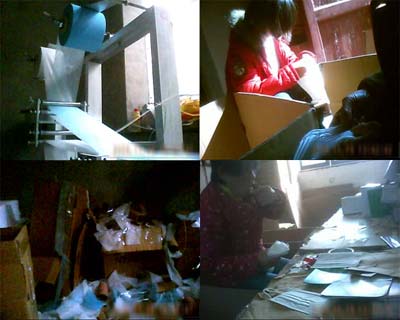 記者看到這里正在進(jìn)行包裝,在這個(gè)所謂的廠家里生產(chǎn)衛(wèi)生用品的工人們,沒(méi)有一個(gè)人穿著工作服,戴工作帽,包裝封口的機(jī)器,也是幾根木條定在一起,就湊合著用了,最出乎記者意料的,還不是這些簡(jiǎn)陋的生產(chǎn)環(huán)境,而是包裝口罩的工人極不規(guī)范的動(dòng)作,看到這個(gè)阿姨一邊蘸著唾沫一邊包裝口罩的手法,讓記者不禁為那些可能會(huì)戴上這包口罩的人感到擔(dān)心。