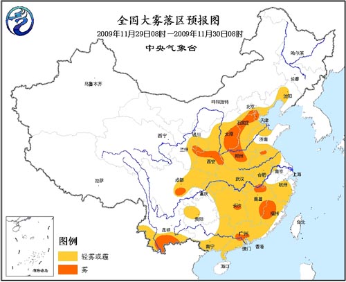 預(yù)計29日早晨到上午,西北地區(qū)東部、華北中南部、遼寧中部、黃淮中西部、江淮大部、江漢、江南大部、華南大部以及四川盆地大部、重慶大部、貴州西北部、云南南部等地有輕霧,其中,北京南部、天津、河北中部和西南部、山西中南部、河南中部、陜西中部、四川盆地南部、湖南中部、江西北部和東部、福建西部、廣東中部、云南南部等地的部分地區(qū)有能見度小于1000米的霧,局地能見度不足200米。