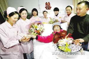 女子叫蔣翠,今年38歲。男人叫張兵,今年44歲。張兵推著妻子,輪椅軋過(guò)紅地毯,迎著空中的花瓣,進(jìn)入病房!白8D銈,你們讓我們懂得了攜手到老的承諾!贬t(yī)生護(hù)士共同祝賀夫妻倆,希望他們“新婚”快樂(lè)。看著布置成新房的病房,蔣翠哭出了聲音。“希望你們能堅(jiān)持下去,恩愛(ài)永遠(yuǎn)!蔽渚傟(duì)醫(yī)院醫(yī)務(wù)處主任向貴平擔(dān)當(dāng)起了主婚人的職務(wù),向夫妻頒發(fā)了結(jié)婚證。這張結(jié)婚證也傾注了醫(yī)院醫(yī)生護(hù)士的心血。通過(guò)和南岸區(qū)民政局聯(lián)系、溝通,婚姻登記處工作人員特地到病房,為蔣翠辦理了結(jié)婚證。