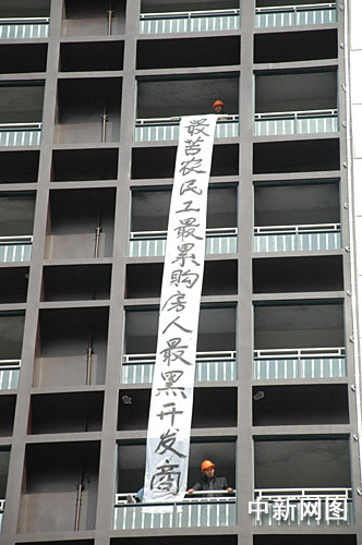 中新網(wǎng)貴港12月16日電 (記者 王剛)16日早,廣西貴港市數(shù)十農民工爬上該市市區(qū)最高樓盤“聯(lián)邦國際”欲跳樓討薪,情緒激動的民工還掛出“最苦農民工、最累購房人、最黑開發(fā)商”、“還我血汗錢”等橫幅聲討開發(fā)商。