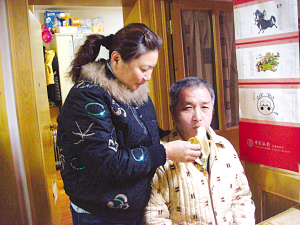 記者離開的時(shí)候,金洪寶想吃點(diǎn)香蕉,陳春莉立即拿來香蕉送到丈夫嘴里,幽默的丈夫說:“靠近點(diǎn)啊,可別讓第三者插足啊!( 王洛峰 張辰 王娟)