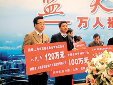 據(jù)介紹,青浦此次舉行的“慈善一日捐”活動(dòng)募得的善款,是該區(qū)歷年募捐總額的2.8倍,創(chuàng)歷史新高。在參與捐贈(zèng)的700余家單位中,景港控股集團(tuán)捐贈(zèng)1000萬元;青浦工業(yè)園區(qū)、上海徐涇建筑工程有限公司、上海豪都房地產(chǎn)開發(fā)經(jīng)營有限公司等18家單位捐贈(zèng)了100萬元以上。(談燕)