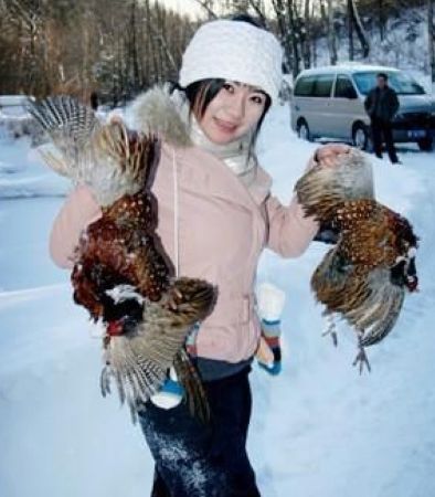 網(wǎng)帖中的女主角五官清秀、打扮入時(shí),她雙手提著中彈的野雞,對著鏡頭一臉微笑地?cái)[起了POSE。另一張照片是特寫,“狩獵女”的淡粉色外套沾滿了獵物的血跡。