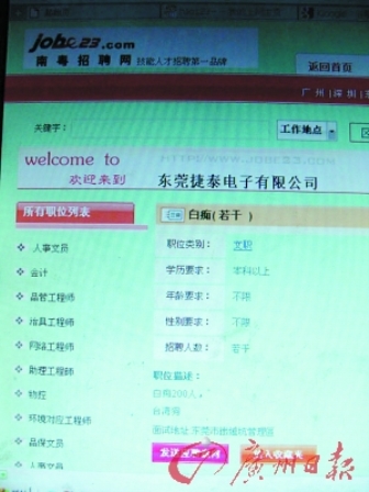 記者在網(wǎng)上搜索,果然看到了報料人所說的招聘信息,分別發(fā)布在南粵招聘網(wǎng)和東莞智通人才網(wǎng)和“我搜網(wǎng)”上。招聘信息注明了職位類別是文職,招聘期限為2010年2月26日至5月26日。在學(xué)歷要求方面,“白癡”要求本科以上,“人妖”要求初中以上,年齡和性別要求則不限,工作地點在東莞。
