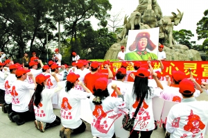 宣誓完畢,活動(dòng)進(jìn)入高潮,“老板們”后退一步,轉(zhuǎn)過身來面對(duì)著雷鋒畫像,齊齊雙膝跪地,以表示“對(duì)雷鋒精神的虔誠和最高敬意”,然后起立對(duì)畫像三鞠躬。隨后,這些人又向路人散發(fā)活動(dòng)的紅色文化帽和文化衫,以號(hào)召更多人“向雷鋒同志學(xué)習(xí)”,把雷鋒精神轉(zhuǎn)化為自己的“心靈財(cái)富”。