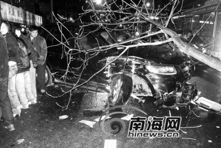 8日晚上9點(diǎn)多鐘,一輛牌號為“瓊A·G7075”的越野車在人多車多的?谖逯干铰飞习l(fā)瘋,它從機(jī)動車道上撞上人行道,接連撞倒了8輛車、撞斷了2棵樹,還把一個(gè)人給撞飛。它沖出50米遠(yuǎn)后“摔”斷右前輪才停下來。