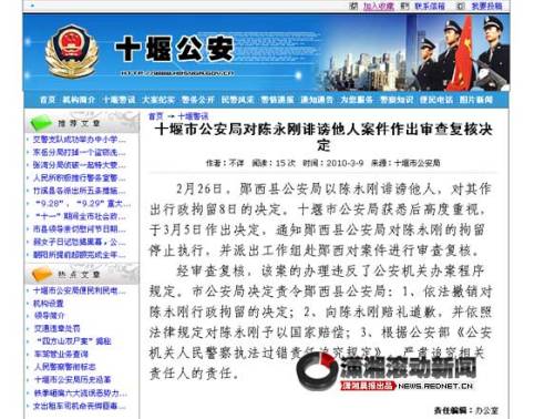 今日零點(diǎn)(3月10日),瀟湘晨報(bào)滾動新聞記者在湖北省十堰市公安局官方網(wǎng)站上發(fā)現(xiàn)一則通告,稱經(jīng)復(fù)核,撤銷撤銷對陳永剛的拘留決定,并向陳賠禮道歉、國家賠償,同時(shí)追究相關(guān)責(zé)任認(rèn)責(zé)任。
