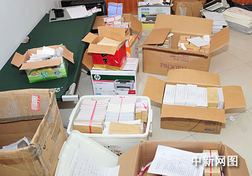 據(jù)悉,警方共奔赴13個抓捕點。記者在一個抓捕點看到,除了一張上下鋪鋼絲床,其余地方都被各類的紙箱占據(jù)。民警隨意打開地上的紙箱,里面都是各式各樣的假發(fā)票,不僅是浙江省范圍內(nèi)的,上海、山東、江蘇等地的假發(fā)票也隨地都是。經(jīng)清點,民警一共繳獲各類假發(fā)票21.3萬份,同時還繳獲了3套電腦、打印機(jī)、掃描儀等印制發(fā)票用普通設(shè)備以及400余枚開具假發(fā)票所使用的偽造公章、假證等作案工具。