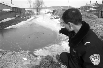 25日14時許,記者來到位于依蘭縣宏克力鎮(zhèn)東北方向的三義村,在村前路口轉(zhuǎn)彎處,記者見到一個寬約10米,長約40余米的條狀大坑,這里就是三個孩子出事的地方。此時的大坑水面上仍結(jié)著冰,但部分冰面已經(jīng)破碎,水面上還冒著熱氣。大坑周圍已經(jīng)圍上了繩索,一塊木板警示牌上面寫著“此處水深危險”,紅色的油漆還沒有干。附近的居民告訴記者,這塊木牌和攔坑的繩索都是今天早晨才設(shè)立的。