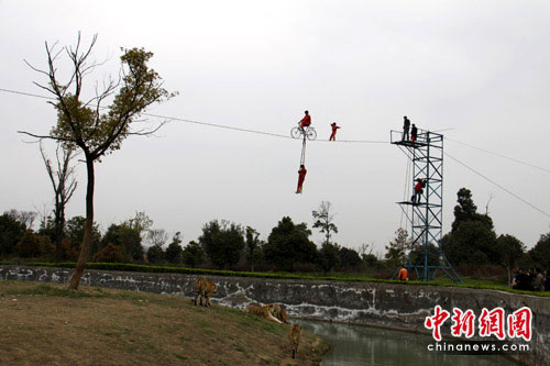 “小燕子”迅速調(diào)整姿勢、繼續(xù)前進(jìn),剛剛十步開外,最驚險(xiǎn)的一幕出現(xiàn)了,園中的老虎似受到現(xiàn)場緊張氣氛的影響,突然顯得有些躁動(dòng)不安,在鋼絲繩下來回走動(dòng),并警覺的看著上方的挑戰(zhàn)者“小燕子”,驚天動(dòng)地般地呼嘯了兩聲后,成年公虎“阿彪”向著“小燕子”所在的上方跳去,差點(diǎn)碰到位于鋼絲下方領(lǐng)路的自行車扶梯上。同時(shí),一只母虎試圖爬到附近的大樹上!靶⊙嘧印币欢认萑肓死匣⒂|爪可及的危險(xiǎn)境地,實(shí)在是讓現(xiàn)場觀眾為她捏了一把冷汗。鋼絲上,命懸一線的“小燕子”,在空中搖晃了幾下,停下來凝神吸氣,盡力控制住鋼絲不再晃動(dòng),一步一步向鋼絲另一端走去。終于,“小燕子”耗時(shí)近20分鐘,成功的完成挑戰(zhàn),一舉突破50米,創(chuàng)造了自己新的紀(jì)錄,爾后空手走到自行車前“凱旋”,觀眾忍不住拍手叫絕。