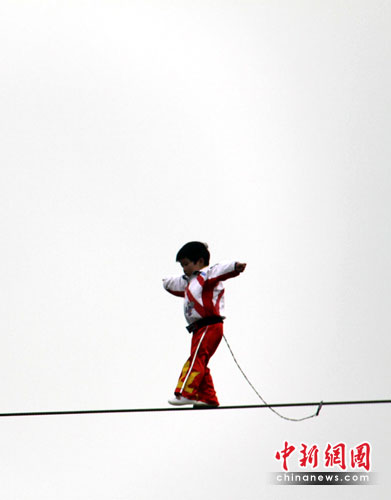 中新網(wǎng)常州3月30日電(記者 唐娟)30日,年僅3歲半的江西女童“小燕子”(藝名,原名張小燕),在江蘇常州淹城野生動(dòng)物世界上演了一出老虎頭上空手走鋼絲的驚險(xiǎn)絕技。在成功走了50米鋼絲后,“小燕子”所在的江西神童藝術(shù)團(tuán)張團(tuán)長宣布,三日后,“小燕子”將向百米發(fā)起挑戰(zhàn),刷新紀(jì)錄,并申報(bào)“虎口空手走鋼絲”吉尼斯世界紀(jì)錄;同時(shí),“小燕子”將在常州淹城野生動(dòng)物世界設(shè)下一個(gè)月的擂臺,歡迎國內(nèi)外各界人士前來挑戰(zhàn),勝者當(dāng)場懸賞100萬元。