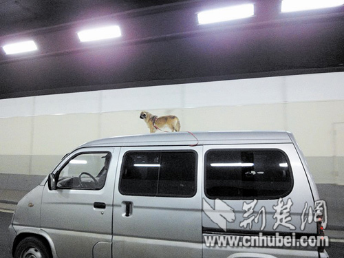 武漢長江隧道現(xiàn)虐狗門 面包車頂上站著小狗(圖)