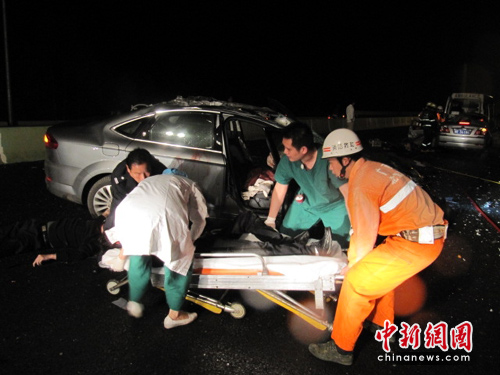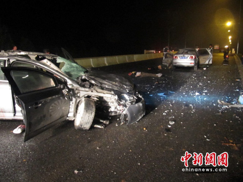 當(dāng)天晚上21時(shí)20分,北海市消防官兵接警到達(dá)位于北鐵收費(fèi)站往鐵山港方向500米處的事故現(xiàn)場(chǎng)后,見(jiàn)一輛車牌號(hào)為滬J86981的福特轎車橫擺在公路中間,車頭破碎不堪,車體頂部面目全非。在距離該車10米左右,一輛車牌號(hào)為桂E36186的力帆轎車亦直擺在公路邊上,車頭和車體也存在不同程度的破損。同時(shí)公路上還灑滿了零零星星的玻璃碎片和車體殘片,地上躺著被甩出車外二男一女已當(dāng)場(chǎng)死亡。而兩車的駕駛員分別被困在駕駛室,動(dòng)彈不得。
