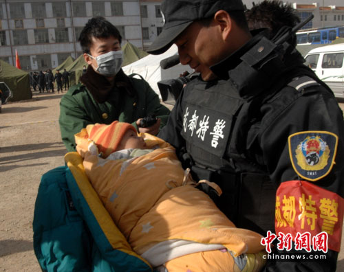 看到這一幕,平時堅強無比的特警隊員們鼻尖一酸,三大隊二中隊副中隊長羅忠義更是觸景生情,滾燙的淚水直在眼眶中翻滾。因為就在他15日奔赴青海玉樹抗震救災(zāi)的途中,他的妻子在家產(chǎn)下了一個可愛的男嬰,而他直到16日下午才通過電話第一次聽到了兒子的啼哭聲。羅忠義和隊友們立即向支隊領(lǐng)導(dǎo)報告,請示能否從十分緊張的救援物資中再擠出一、兩頂帳篷給這些受災(zāi)群眾入住。請示很快得到了特警支隊領(lǐng)導(dǎo)的同意,并得到了隨隊的市局裝財處救援前線保障組的大力支持。