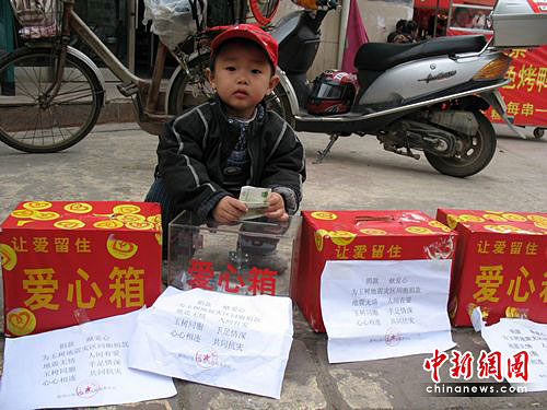 4月18日上午,市民杜鵬帶著4歲的兒子捐款2000元。他告訴紅十字會工作人員,兒子在電視上看到青海玉樹地震災情后,非常著急,拽著我向災區(qū)小朋友捐款,今天休息帶孩子就來了。另外,徐州大馬路小學三(3)班的學生自發(fā)為地震災區(qū)學生捐款852.6元。