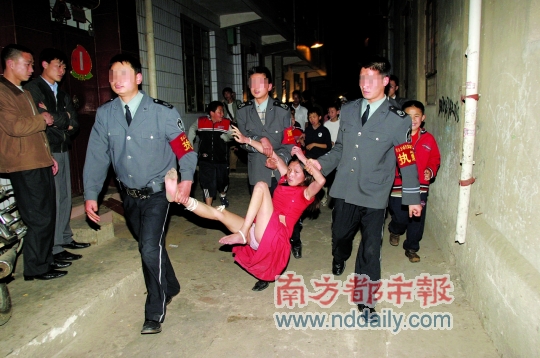 “我那天去晚了,本來是在這個城中村拍其他的,聽到爆料說有人跳樓就趕了過去!睍r任昆明《都市時報》攝影記者的黃興能對南都記者說,“我趕到的時候人已經(jīng)被消防救了下來,然后就把人交給了聯(lián)防隊員,但她還在不停掙扎,這時候,照片中左邊第一個聯(lián)防只好抬起女子的右腳往前走,我恰好捕捉到了這個瞬間。在拉的過程中,這名女子一直強烈反抗。最后把她抬進了治安崗?fù)。?/p>