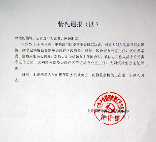 4月23日,有媒體披露2003年10月郾城縣大劉鄉(xiāng)(2005年劃歸源匯區(qū)管轄,更名大劉鎮(zhèn))農(nóng)民徐林東狀告鄉(xiāng)政府,被鄉(xiāng)政府送到精神病院的有關(guān)遭遇,引起各界關(guān)注。漯河市委市政府領(lǐng)導(dǎo)迅速作出批示,要求盡快查處。