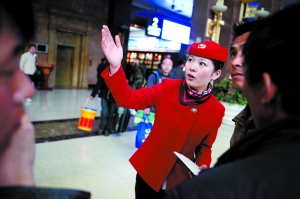 昨日,北京站,換上新裝的女客運員在為旅客指路。當(dāng)日,北京站和北京南站的女客運員,全部換上了“空姐式”新裝,讓很多乘客眼前一亮。北京站有關(guān)人士表示,此前女客運員為深藍(lán)色大蓋帽套裝,此次統(tǒng)一換為紅色掐腰上衣、黑色長褲、紅禮帽、彩色絲巾。而更換新裝,主要是改變乘客對客運員嚴(yán)肅的老印象,服裝的暖色調(diào),也可拉近乘客與客運員的距離。在更換新裝的同時,火車站也將提升服務(wù)水平,為旅客提供“空乘式” 服務(wù)。本報記者 王嘉寧 劉澤寧 實習(xí)生 周琦 攝影報道