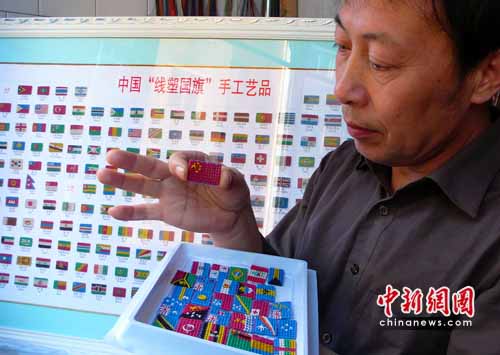 中新網(wǎng)4月30日電(馮文芳)為迎接舉世矚目的上海世博會(huì),山西侯馬工程師郝建安用直徑為0.78毫米的彩色電纜線,制作出方寸大小的世界各國(guó)國(guó)旗,喜迎上海世博會(huì)。他編制的國(guó)旗結(jié)構(gòu)緊湊,造型嚴(yán)謹(jǐn),微觀寫意,巧妙夸張,富有立體感。