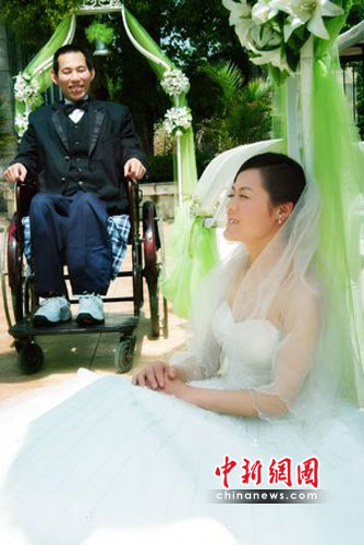 中新網(wǎng)徐州5月7日電 (記者 邵國(guó)棟 董敏)拍攝一套婚紗照對(duì)結(jié)婚新人是一件再普通不過的事了,但是對(duì)于江蘇銅山縣大彭鎮(zhèn)34歲高位截癱的范進(jìn)來說,卻是一件不可能做到的事情。為了幫這對(duì)特殊的新人圓夢(mèng),徐州市眾多影樓紛紛伸出愛心之手,愿意為他們免費(fèi)拍攝婚紗照。6日下午,在徐州市新新娘婚紗影樓大廳,記者見到了范進(jìn)和他的妻子李美玲!白詮陌c瘓后就沒想過結(jié)婚一事,更別說拍婚紗照了!”范進(jìn)這樣對(duì)記者說。
