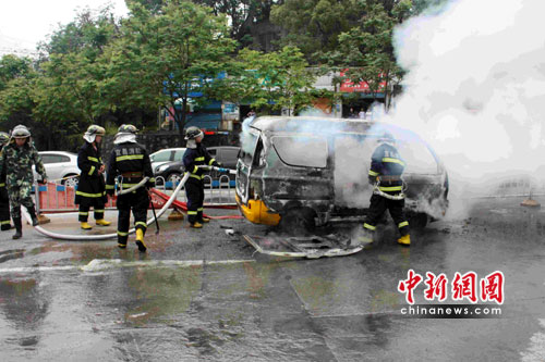 中新網(wǎng)宜昌5月7日電(郭曉瑩 王申)5月7日下午,湖北省宜昌市一輛黃色面包車失火,消防官兵接到報警后迅速趕到現(xiàn)場將火撲滅。